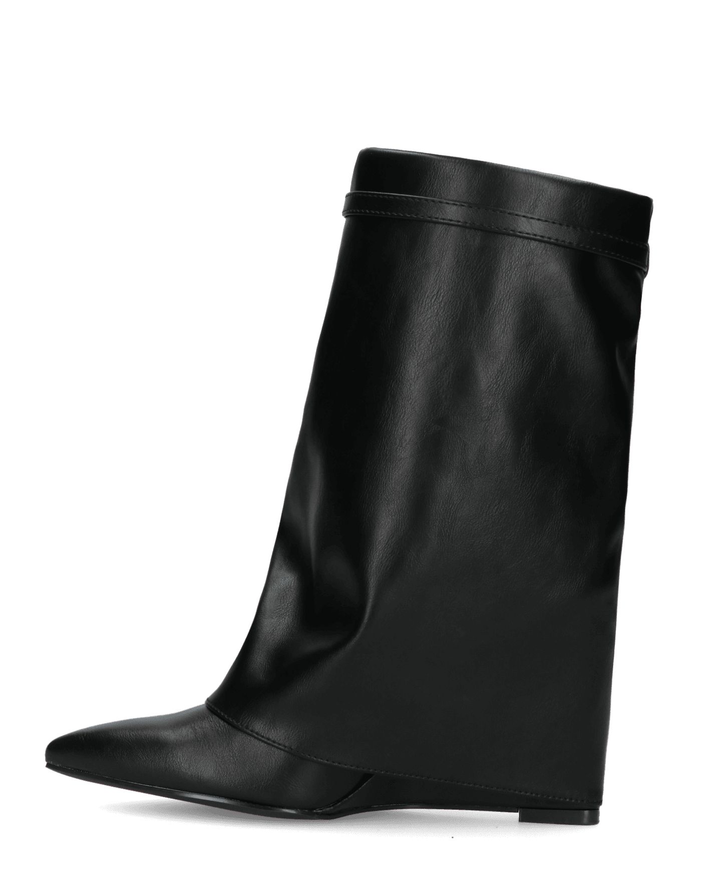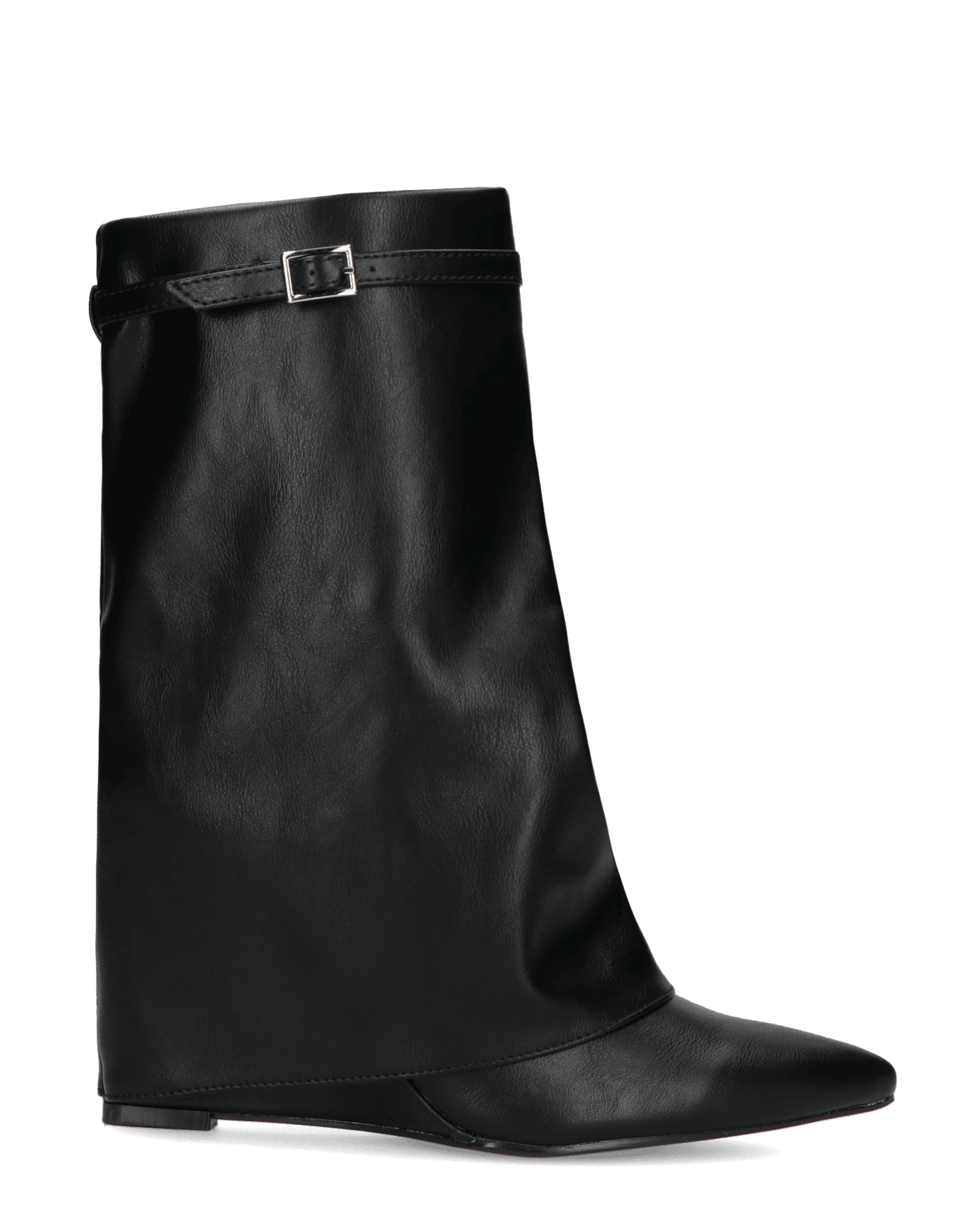 TAINA | Czarne Botki Z Niskim Cholewką Z Faldkiem I Koturnem to klasyka w szafie z charakterem: wytrzymałe, wygodne i stylowe. Ich zbalansowana cholewka i podeszwa zapewniają wsparcie i stabilność podczas Twoich ruchów, dodając eleganckiego akcentu do Twoich sezonowych stylizacji.