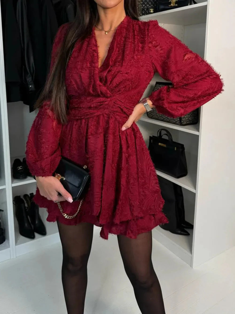 Mila | Valerisse Sukienka Mini Bordowa z Teksturą i Krzyżowym Dekoltem celebruje funkcjonalną elegancję: zwiewny materiał, korzystny krój i sylwetka, która wysmukla bez obcisłości. Idealna na dzień i noc, łatwo łączy się z marynarkami lub sandałami.