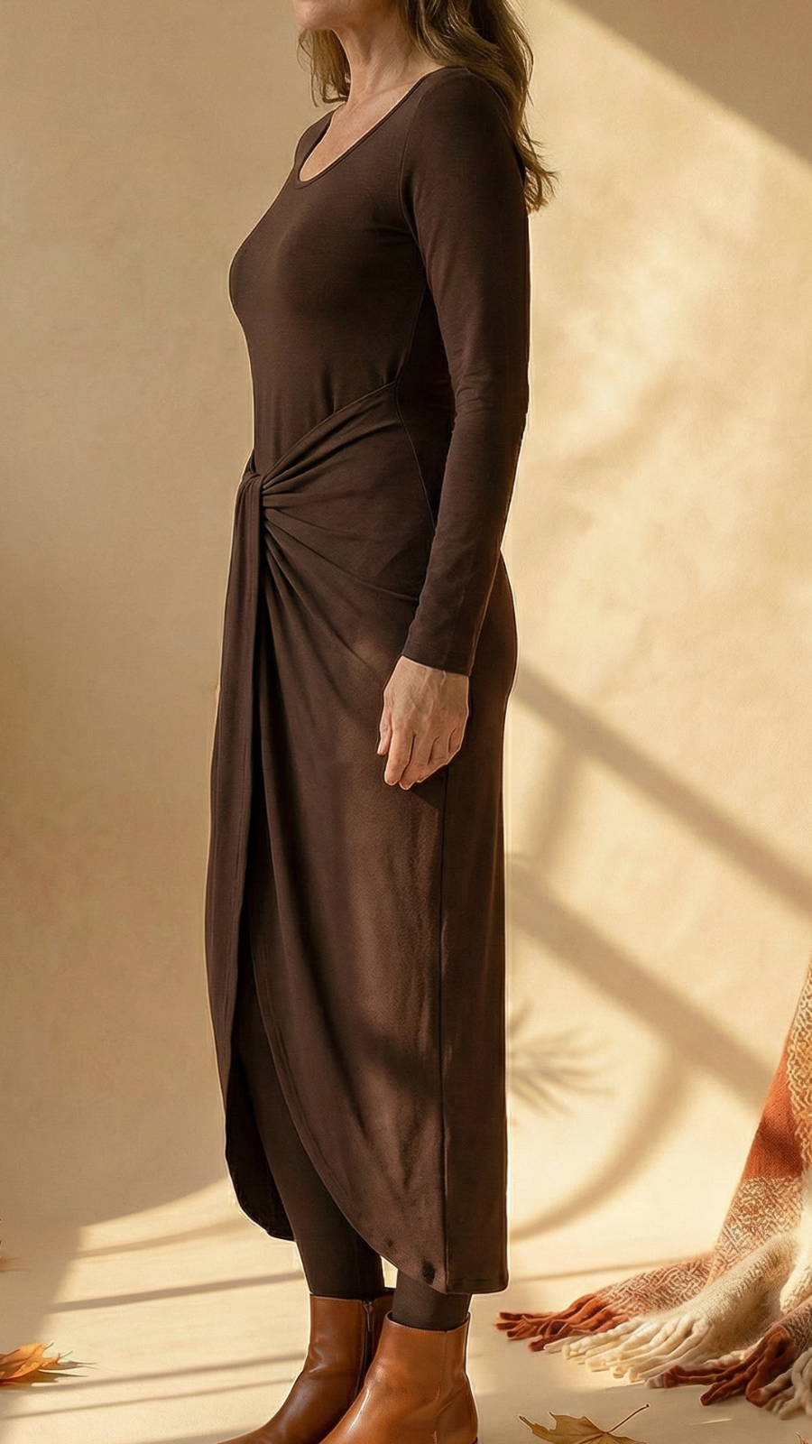 Paloma | Nela Sukienka Maxi Czekoladowa z Marszczeniem i Rozcięciem celebruje funkcjonalną elegancję: zwiewny materiał, korzystny krój i sylwetka, która wysmukla bez uciskania. Idealna na dzień i noc, łatwo łączy się z marynarkami lub sandałami.