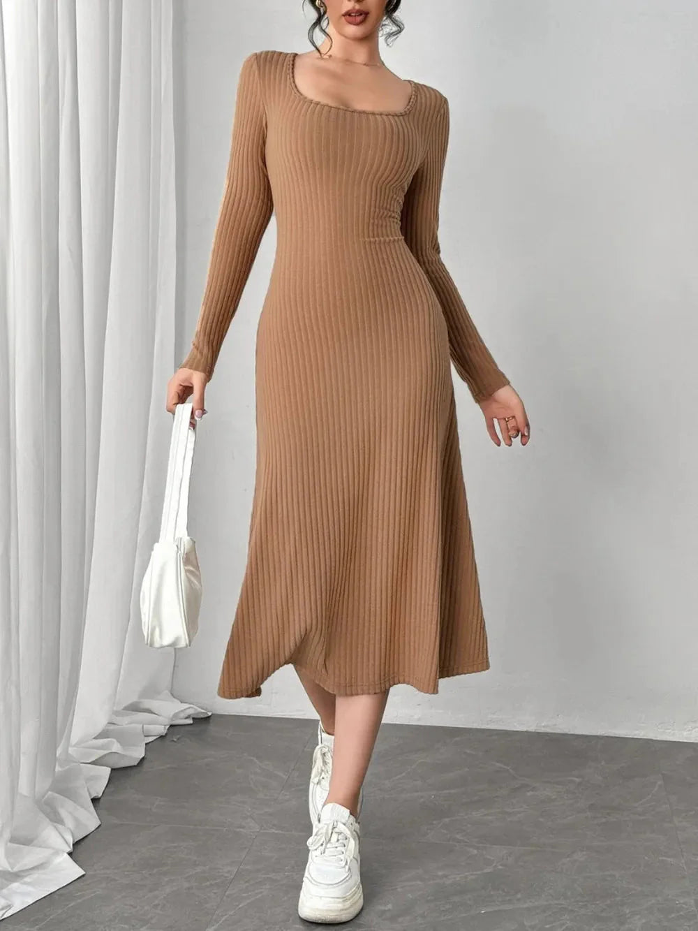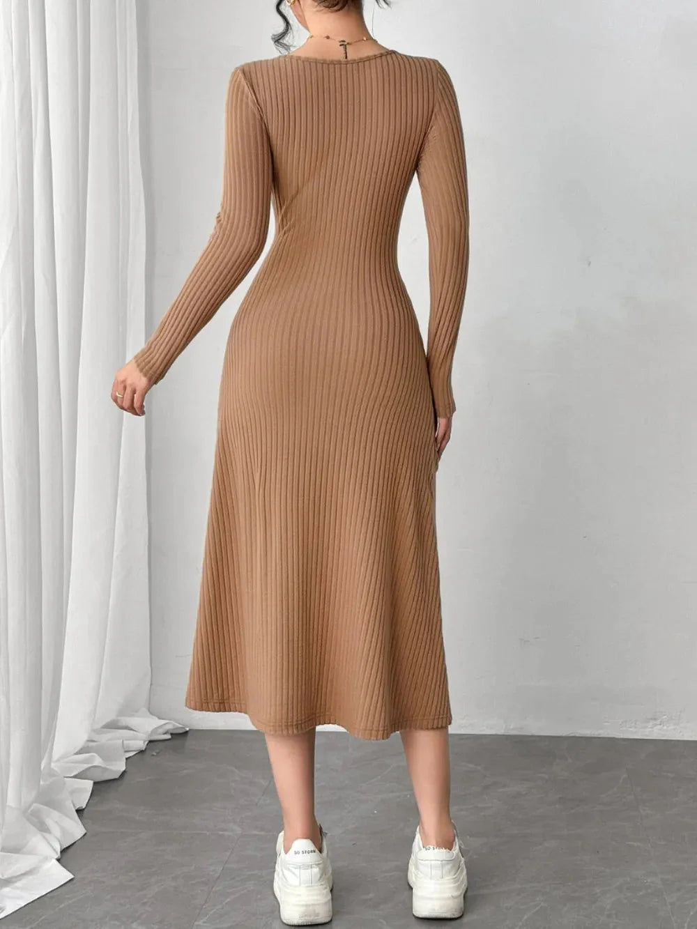 Rocío | Cecylia Sukienka Midi z Dzianiny Prążkowanej celebruje funkcjonalną elegancję: płynny materiał, korzystny krój i sylwetka, która wysmukla bez ucisku. Idealna na dzień i noc, łatwo łączy się z marynarkami lub sandałami.